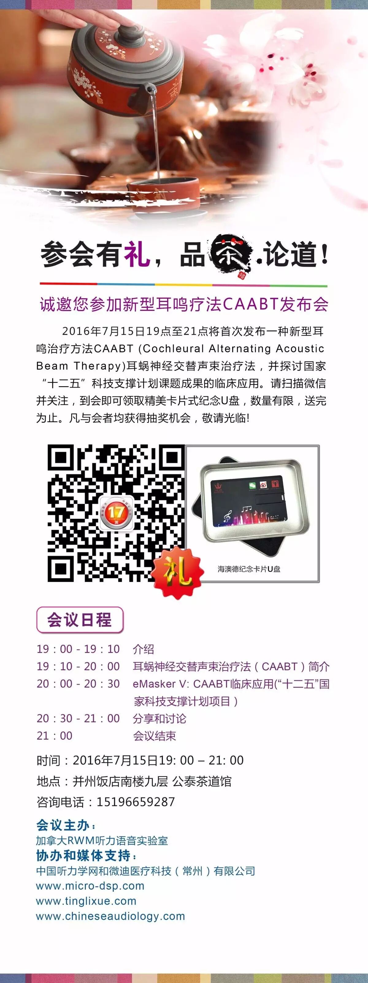 由加拿大RWM听力语音实验室主办,微迪医疗科技(常州)有限公司协办的新型耳鸣疗法CAABT发布会将于2016年7月15日19点至21点在太原市并州饭店南楼九层(公泰茶道馆)举行。